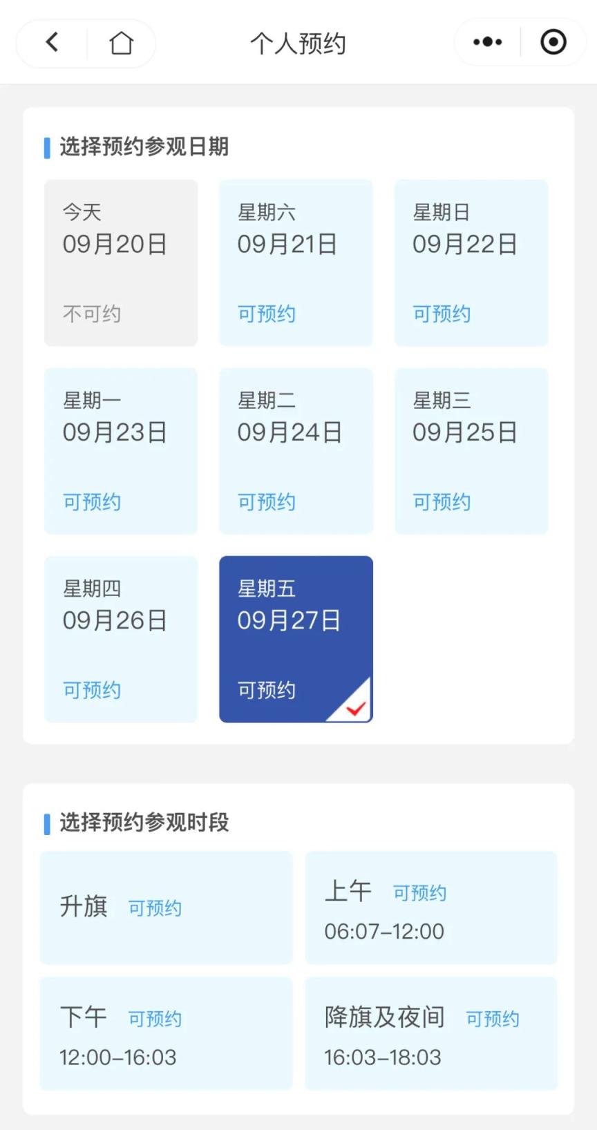 凭证预约参不雅教导,可预约日历逐日中午12时更新。今天(9月20日)已可预约9月27日参不雅,也即是说,9月24日(下周二)即可预约10月1日升旗庆典不雅礼(若使用小门径预约,请将手机微信升级到最新版块)。